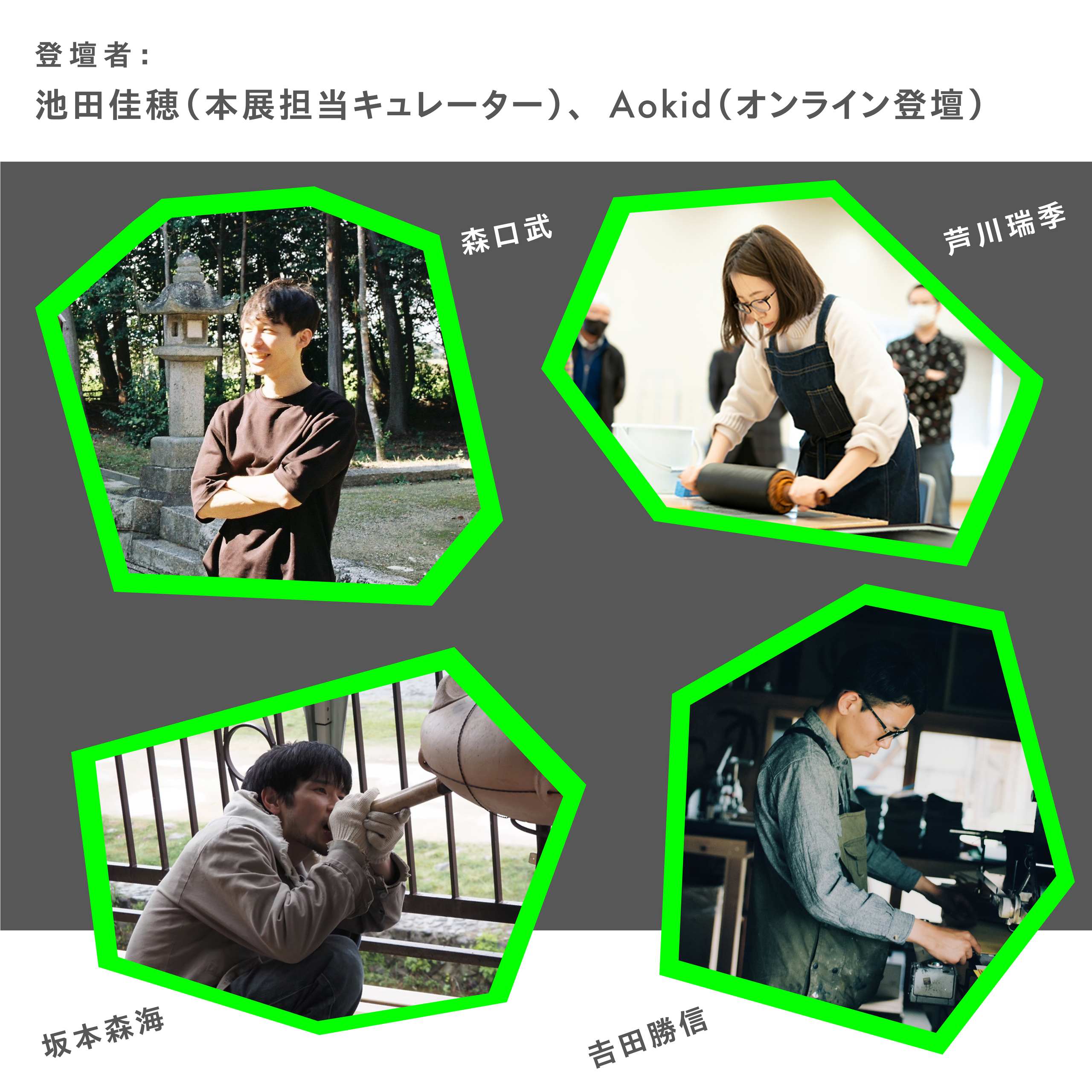 今回のバグスクールのメインビジュアルは、天然アスファルトを用いて𠮷田勝信さんが制作しました。「アスファルト」をテーマに、𠮷田さん、芦川瑞季さん、坂本森海さん、Aokidさん、そして文化人類学者・森口武さんが集い、その多層的な魅力を語り合います。