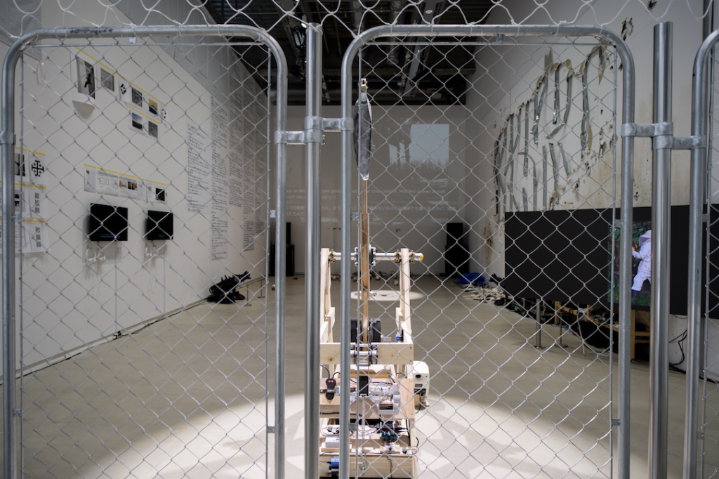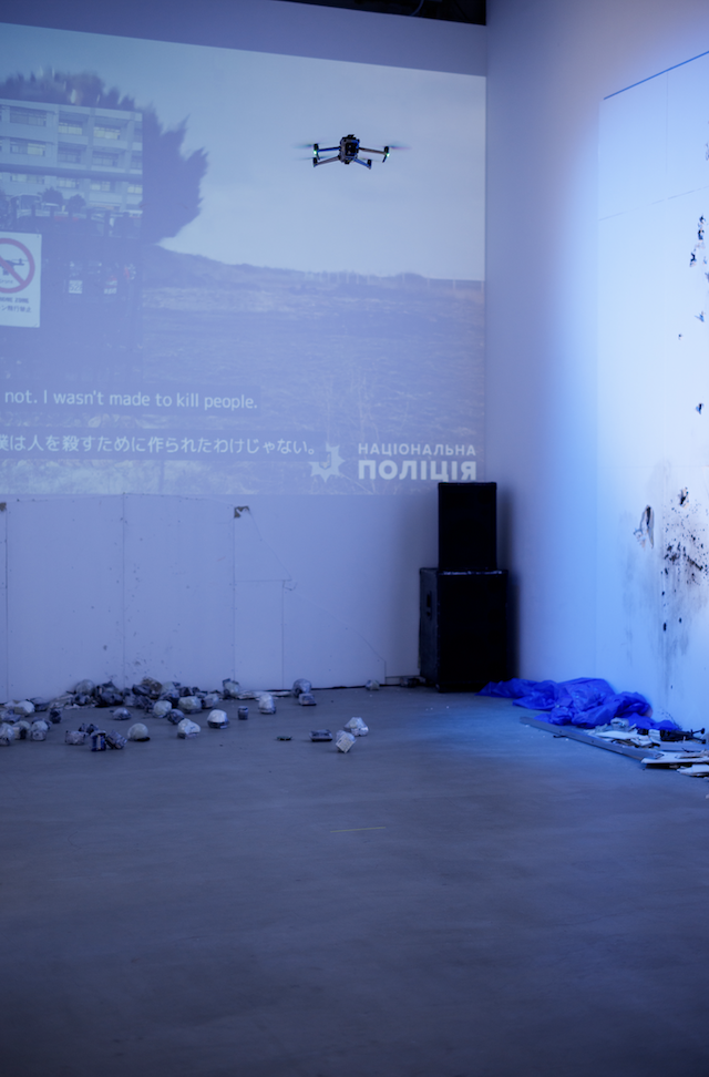 「戦争」という、ともすると躊躇するような大仰な設定は、しかし、長引くロシア・ウクライナ戦争にイスラエルによるガザ侵攻、さらに本展の最中に勃発したイスラエル・アメリカによるイラン攻撃と、第二次世界大戦を経験した人類が性懲りもなく続ける、非常の日常化への欲動に対する作家および企画者の切迫した危機感があるからだろう。そしてこうした戦争こそが、目下、私たちの認識や行動を急速に統御し始めた生成AIの技術開発を推し進め、非倫理的に活用する実験場となっているからである。航空機にはじまりレーダーや原子爆弾、弾道ミサイル。いうまでもなく戦争は技術(テクノロジー)とインフラを大幅に更新し、なにより資本主義を駆動させるガソリンの役割を果たしてきた。その極めつきが本作の主役となるドローンであり、そこに実装されたAIというわけである。