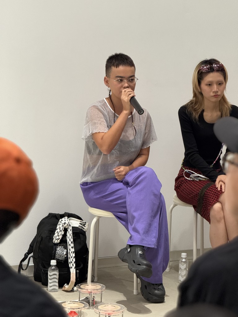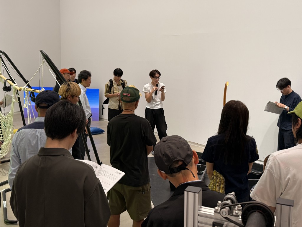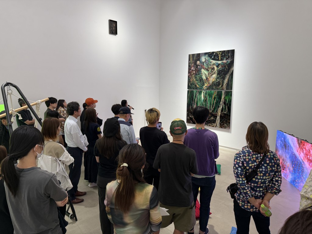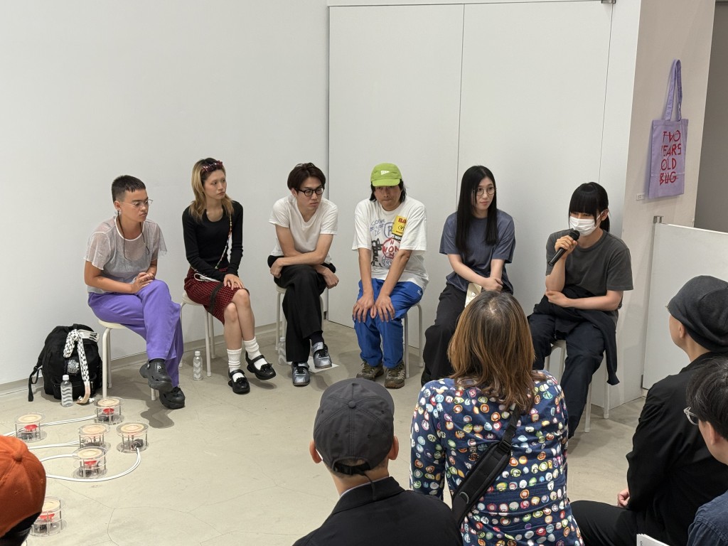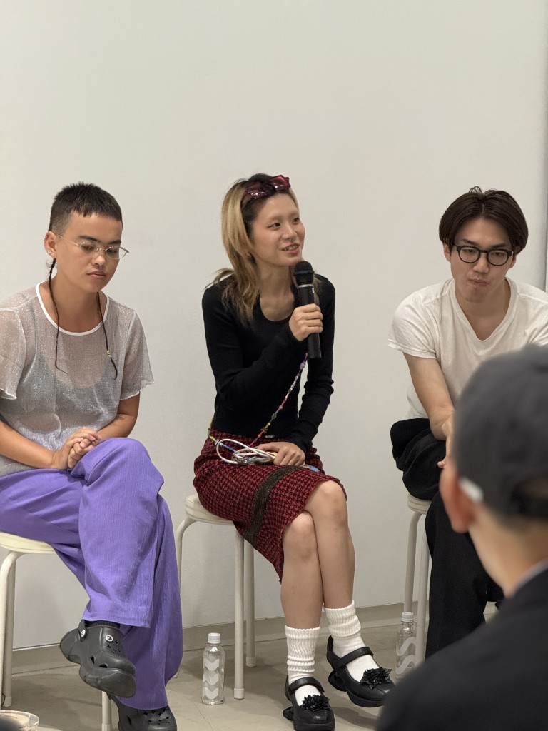 俳優として舞台作品への出演も行っている徐秋成は、「チェルフィッチュ」の公演のため、搬入直後から兵庫県豊岡市に滞在していたため、トークの日が開催後に初めて自分の展示を観る機会となった。また、会場入口にインパクトのある大作を設置した善養寺歩由は、東京ミッドタウンによるコンペティション「TOKYO MIDTOWN AWARD 2025」にも選出されたとのことで、「搬入日がもろかぶりで、ミッドタウンでの夜通しの作業のあと、少しだけ仮眠をとったらもうBUGの搬入に行かないといけなかったのが大変でした」と振り返る。搬入直前の制作も含めてほとんど寝られない日々が続き、「今はどう体を休めたら良いのか分からない」と振り返る。