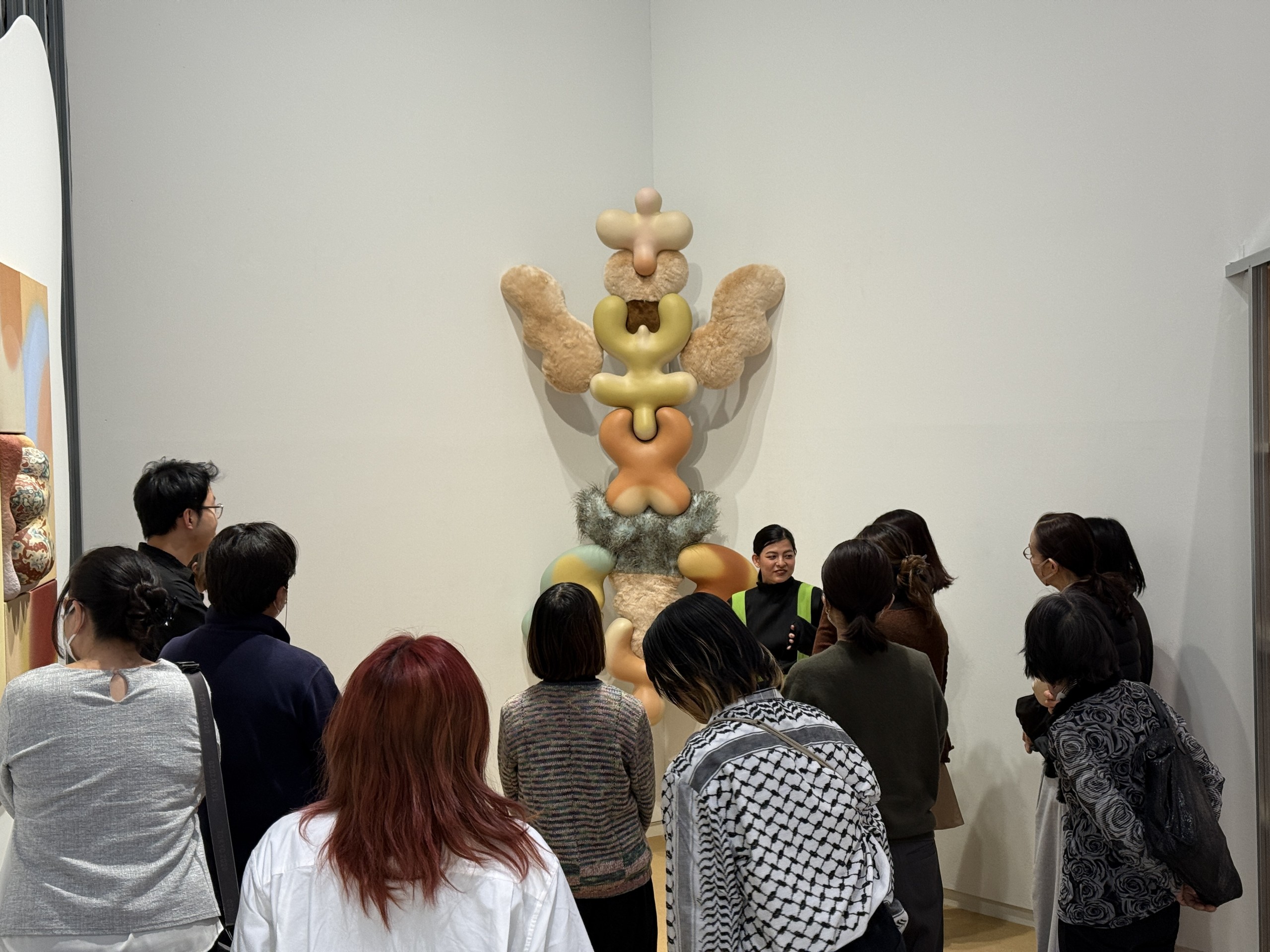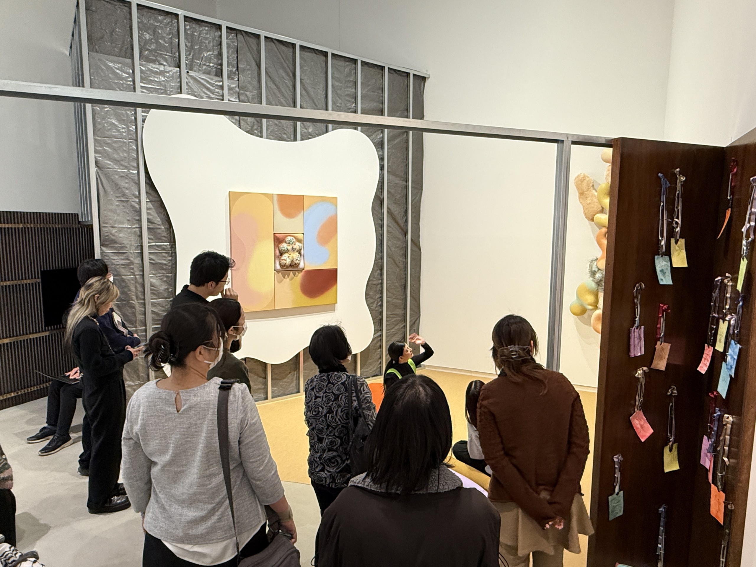 幼少期から母に連れられ毎年バリを訪れていたKANOKOさんは、大学卒業後すぐにインドネシアへ移住し、現地での生活も11年目を迎える。池田さんも強く同意するように、インドネシアで制作する魅力は、とにかくフレンドリーで積極的に人をサポートする国民性があり、新しいことを始めるハードルが低い点だという。また、日本とは比較にならない程スタジオの賃料が安く、大きな作品でも制作しやすい点も重要だと二人は声を揃える。具体的な金額も交えながら、KANOKOさんがどのようにスタジオを設立し運営してきたのか、リアルな実体験が語られた。特に、制作に欠かせないアシスタントのリクルートや人間関係については非常に実践的な話が共有された。また、KANOKOさんが専属のマネージャーと契約し、様々な活動をサポートしてもらっているという点も、日本のアート関係者にとっては新鮮な話題だった。さらに、現地の文化や自然に学び、それらを柔軟に自身の制作へ取り入れていくKANOKOさんのスタイルについても詳しく語られ、展示作品をより深く体感する手がかりとなった。