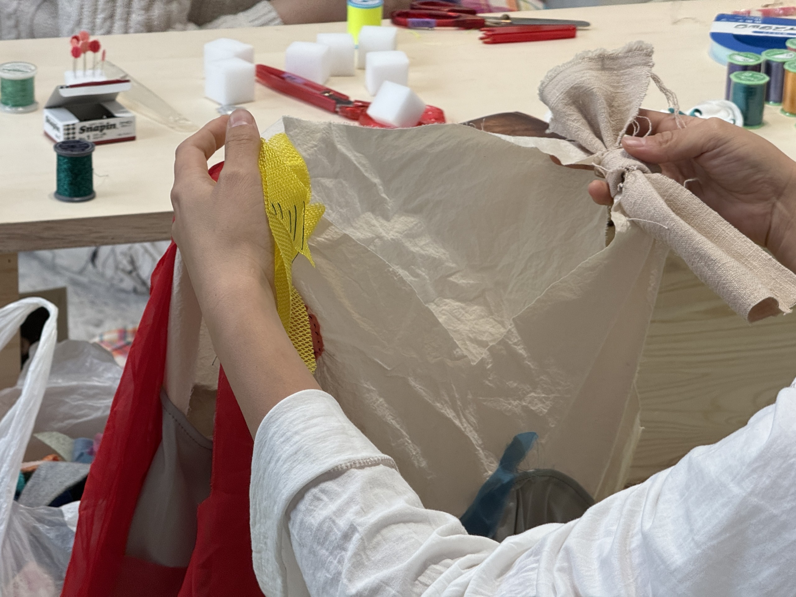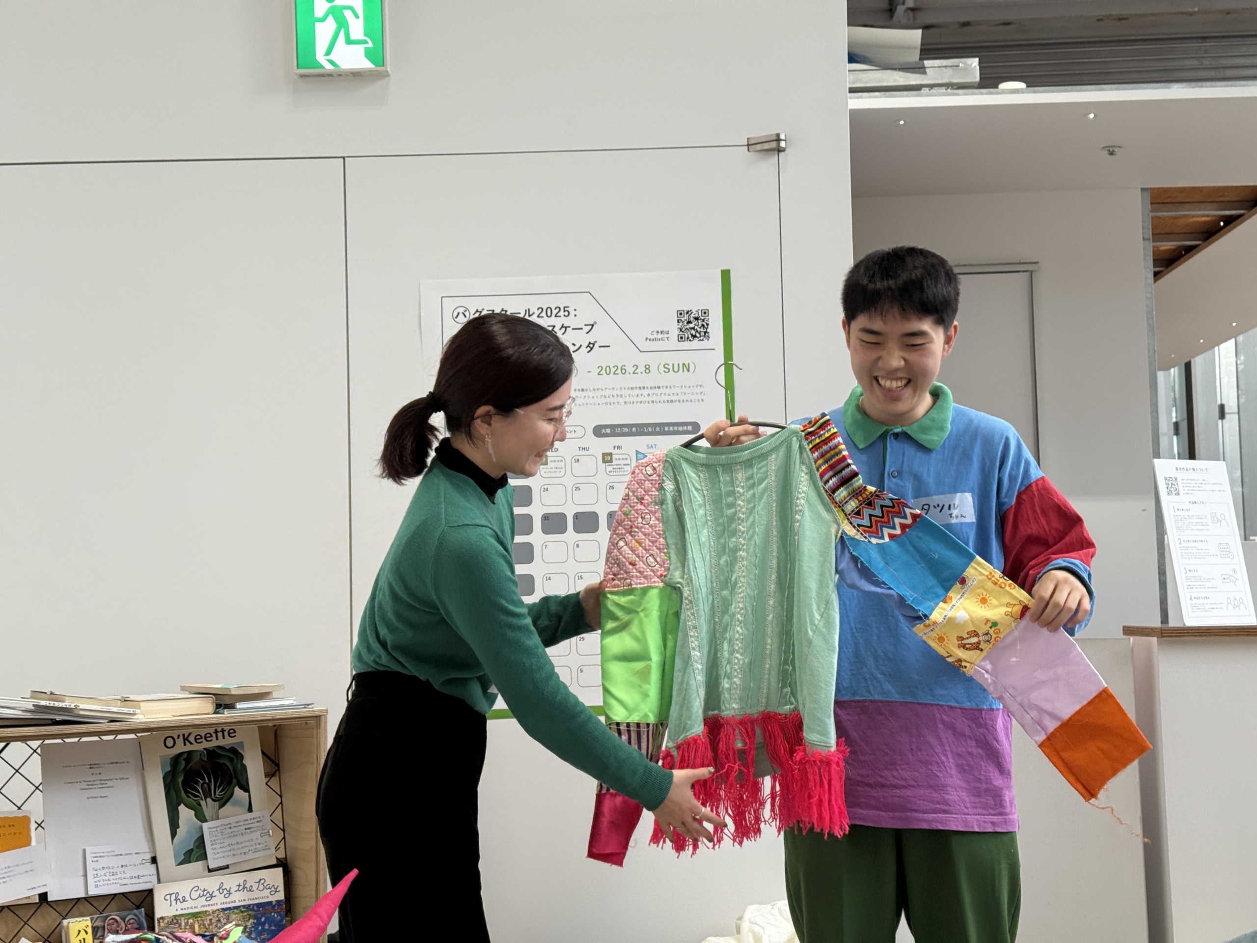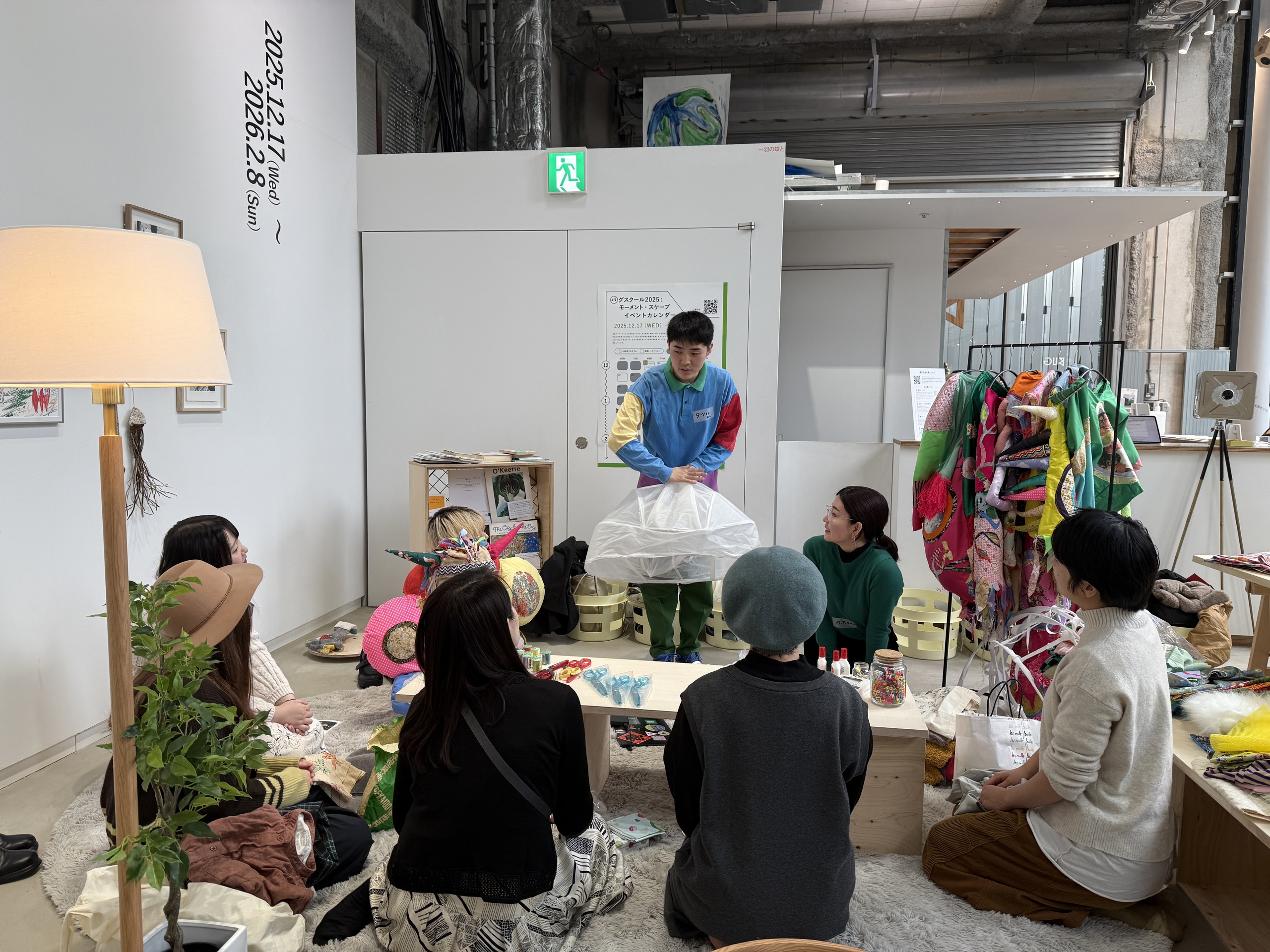 参加者は、実際に作って身につける行為を通して、タツルさんの作品や考え方との距離がぐっと縮まったに違いない。自分は服飾の専門家ではないと言うタツルさんの普段の制作のように、技術や正解を学ぶのではなく、各自が自由に作品を作り、身につけ、自分を表現できる鮮やかな時間だった。(本展運営アシスタント:山下港)
