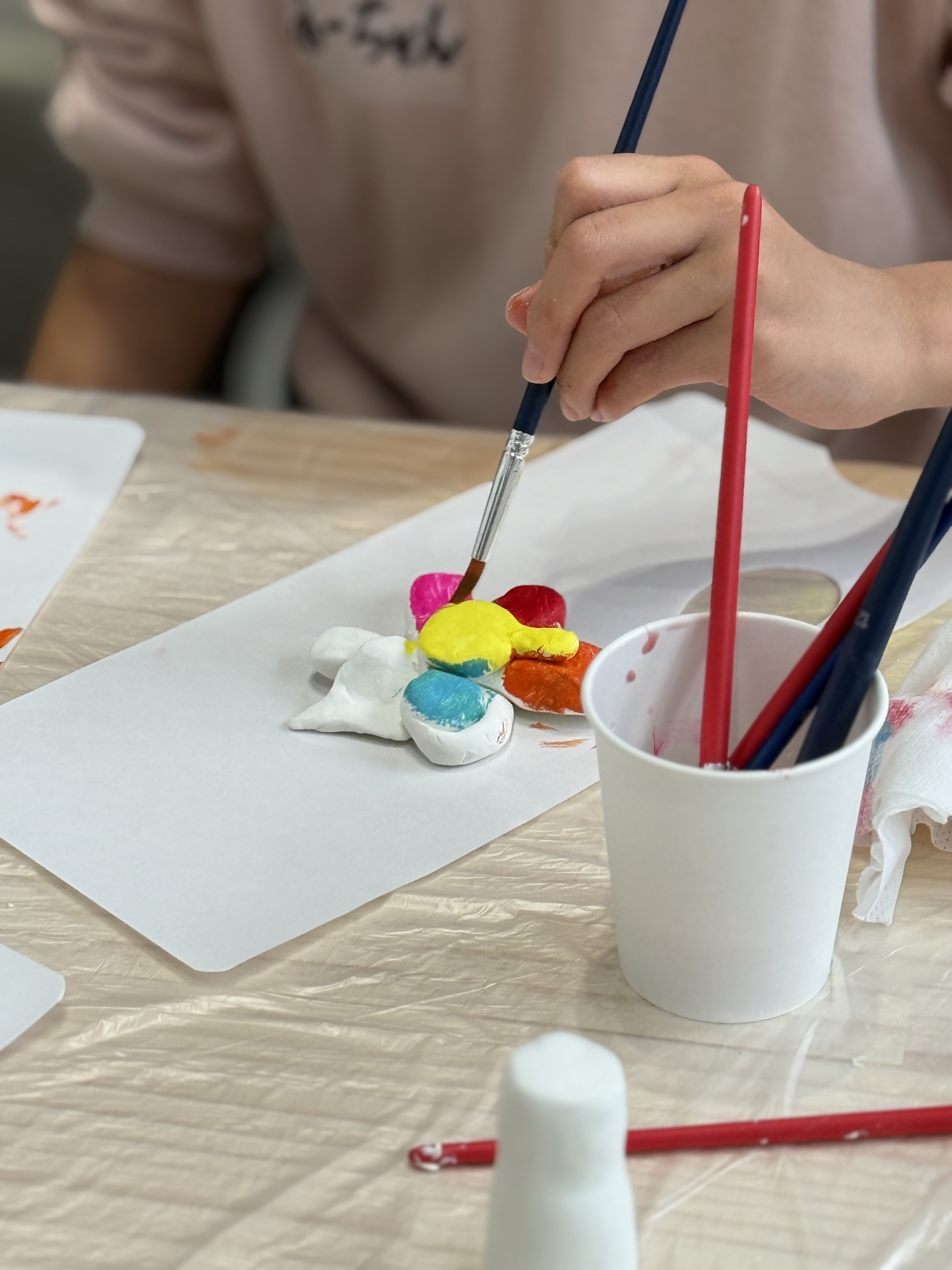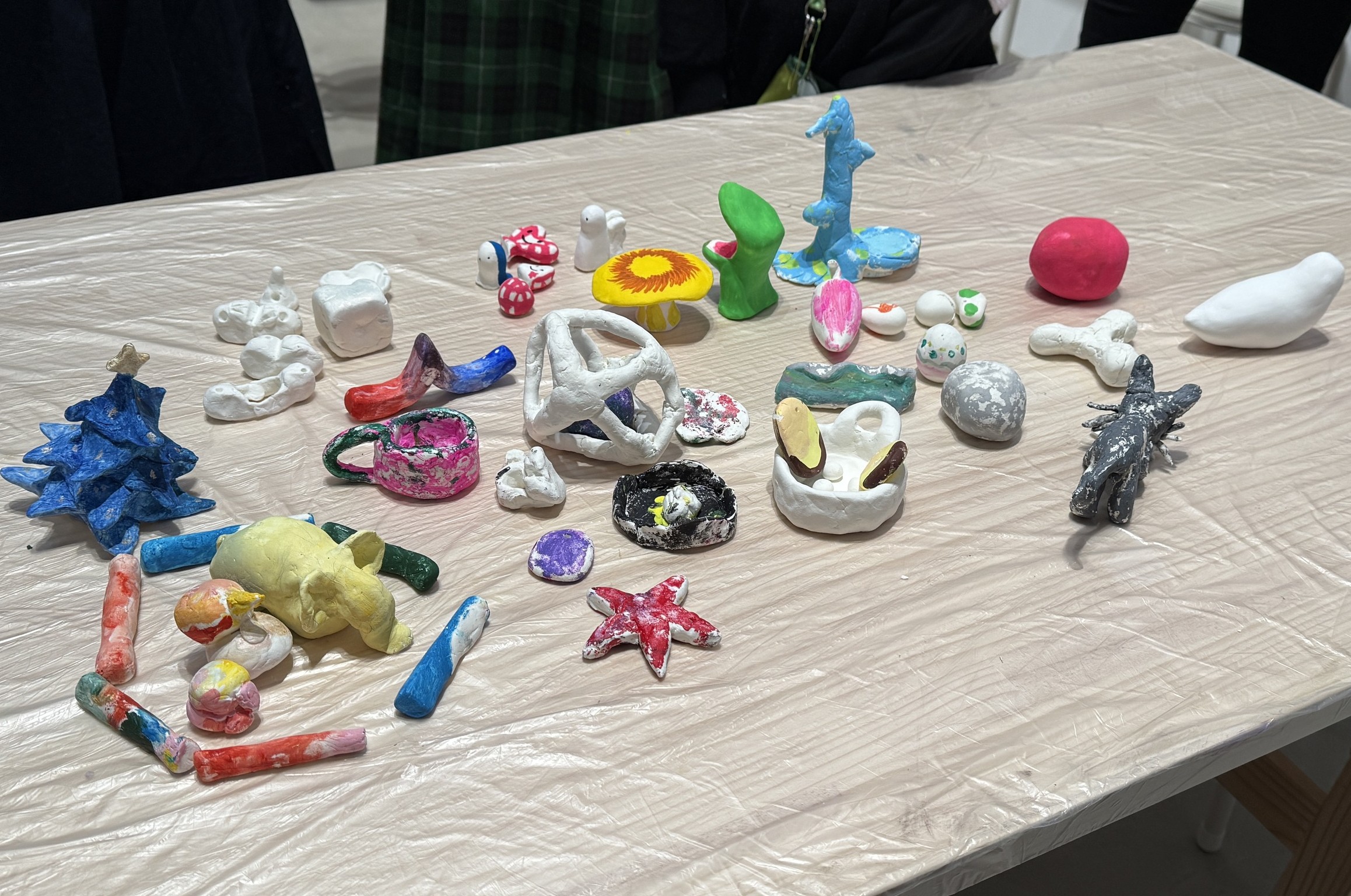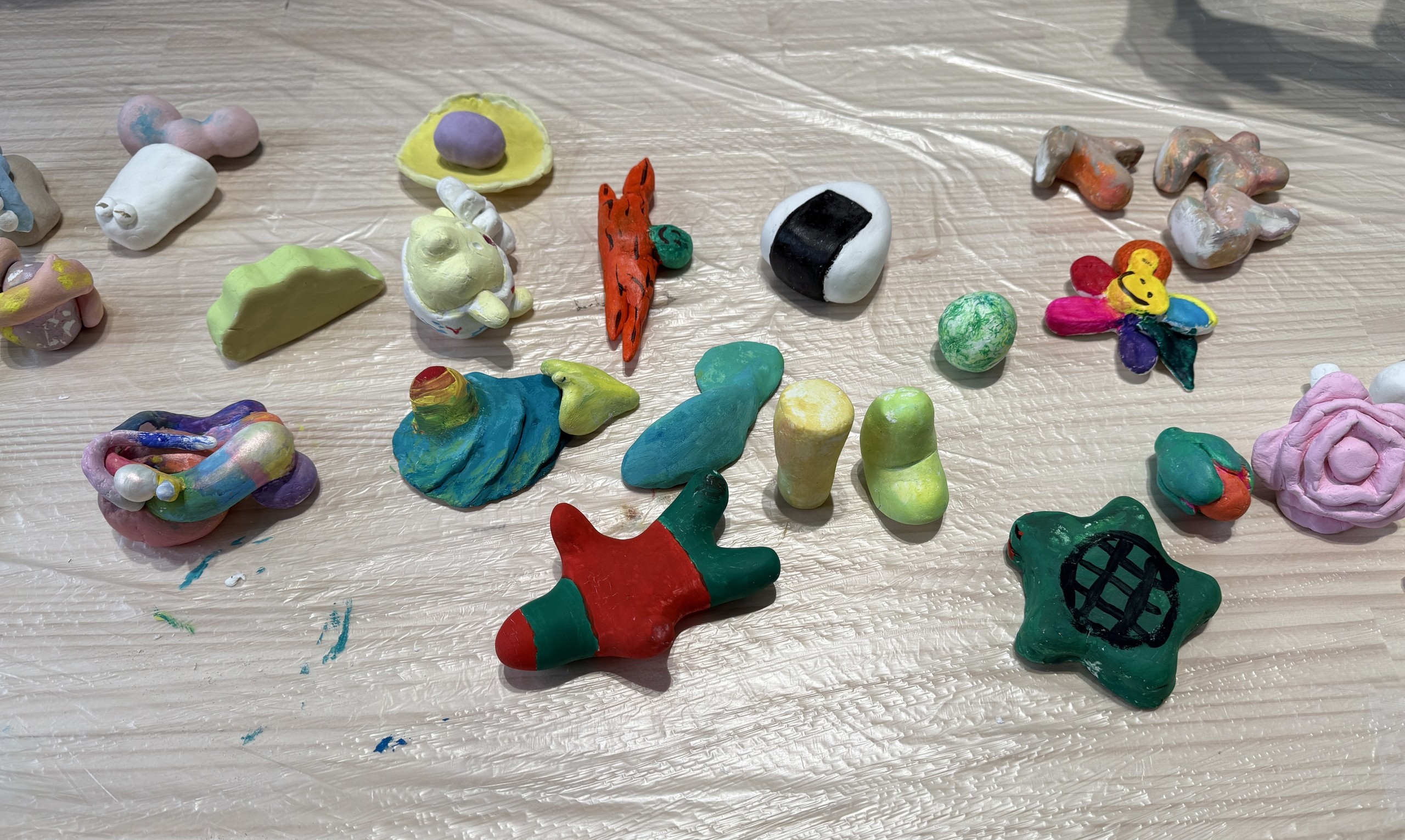 KANOKOさんは、人によって多様な見方が生まれる自身の作品を、「鑑賞ではなく体感して欲しい」と語る。その姿勢のように、今回のプログラムでの制作も正解はなく、それぞれの自由な表現に委ねられた。まず、彼女自身も制作に用いている石粉粘土で、「一緒に帰りたくなるような」相棒の形を作る。形が決まると、ドライヤーで乾かし、紙やすりで表面を磨いていく。滑らかになった粘土のツルツルした感触こそ、KANOKOさんが参加者に是非体感してもらいたいと願ったものだ。「人の根源的な感覚である触覚を大切にして欲しい」と彼女は言う。また、この磨きの時間は制作の中でも特に自分の世界に没頭できるひとときで、KANOKOさんにとっては瞑想的でもあるそうだ。参加者も、その言葉の意味を実感する時間が流れていく。そして、納得いくまで磨いたら、自由に色を着けて完成となった。最後に、それぞれの作品を「体感」し、感想を共有し合った。