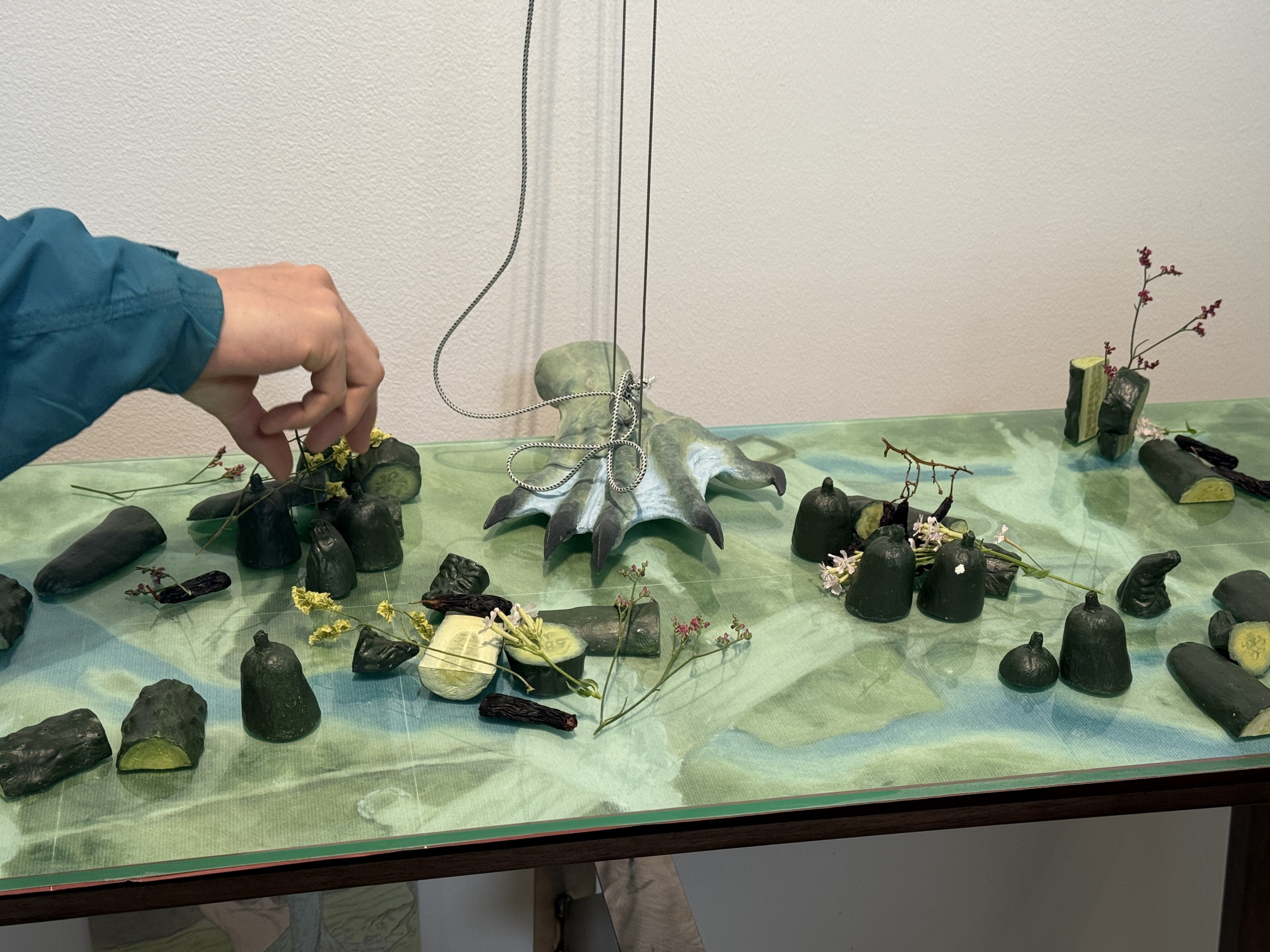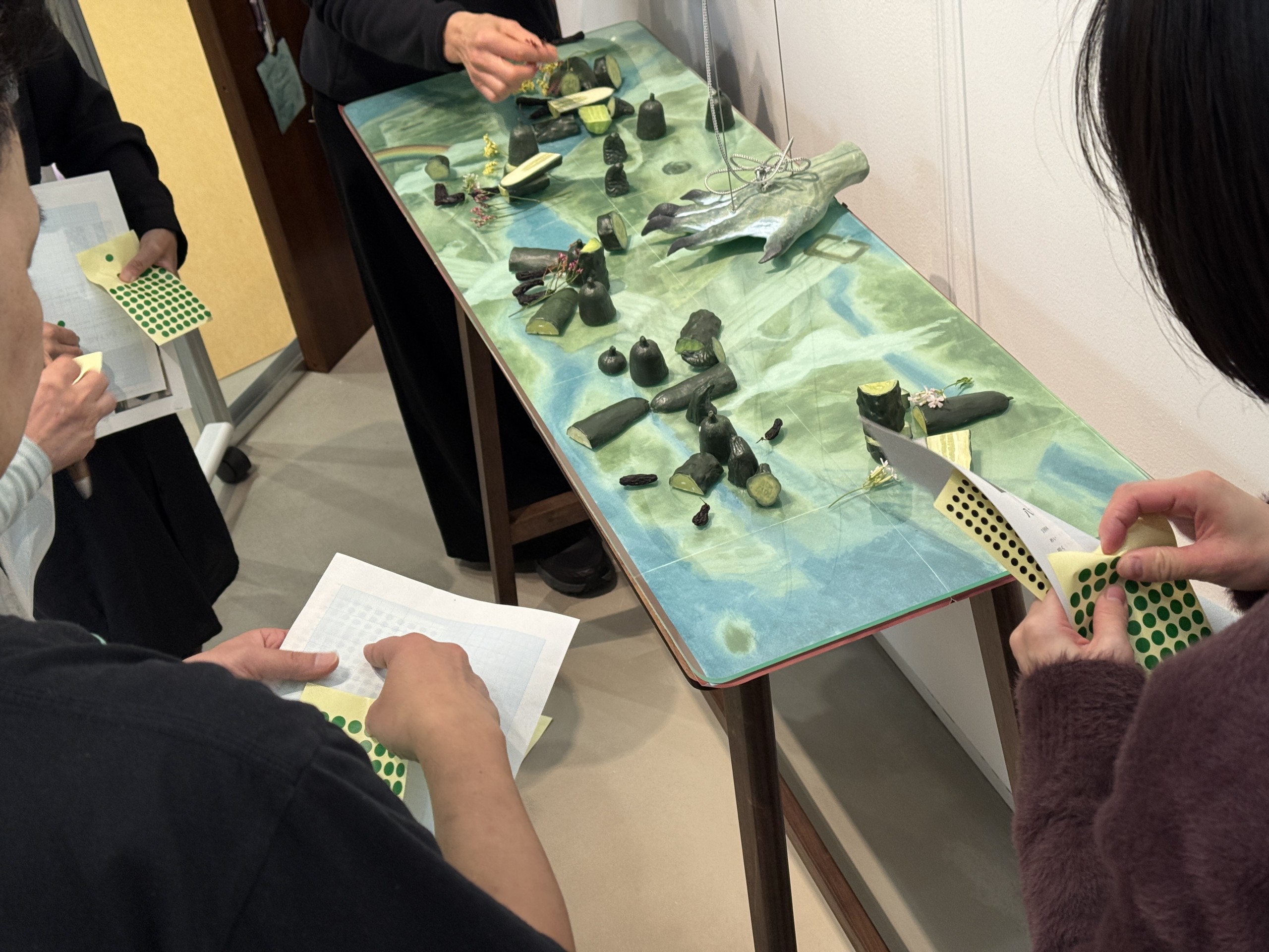 まず、色々な形に切られたきゅうりの立体作品を並べ、それぞれが何に見えるか、みんなで考えて、名前を付ける。普通きゅうりに名前を付けることなどないが、連想を広げていく八木さんらしいアプローチだ。そのきゅうりを、実際の展示に使われているテーブルの上に並べて、半魚人の手をテーブルの上に叩きつけ(紐に結われた手がテーブルに落ちる仕組みで、展示中に誰でも体験できる)、きゅうりを散乱させることで、2つのゲームに展開する。1つ目は、散らばったきゅうりの形から連想するイメージを伝え合うというもの。それぞれがきゅうりを組み立て、散乱させ、草花で装飾し、その様子を方眼紙に記録し、連想してイメージを伝えるというプロセスを、5分にも満たないスピードで行っていく。2つ目は、2チームに分かれてきゅうりの崩れ方を競うもの。半魚人の手の衝撃で、八木さんの心に響くような形にきゅうりが散らばるように、両チームが工夫してきゅうりを組み上げる。どちらのゲームも明確なルールが決まっている訳ではなく、もっと楽しむためにはどうすれば良いか、実際にゲームを楽しみながら参加者と八木さんとの間で考えていった。