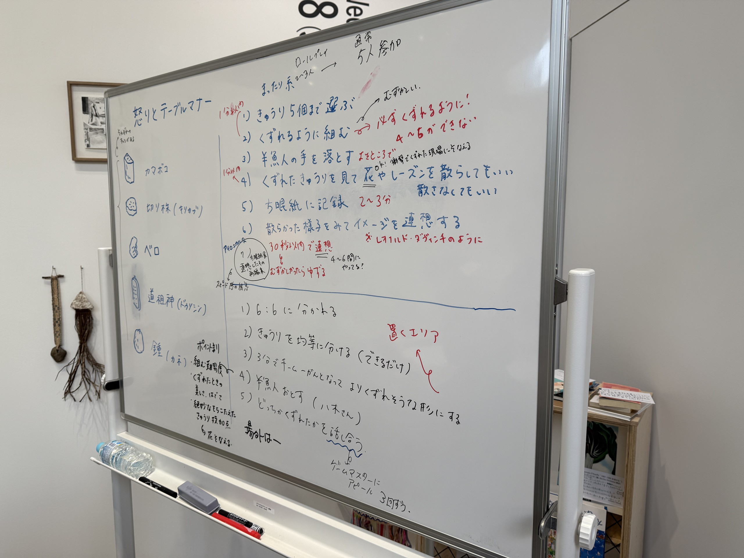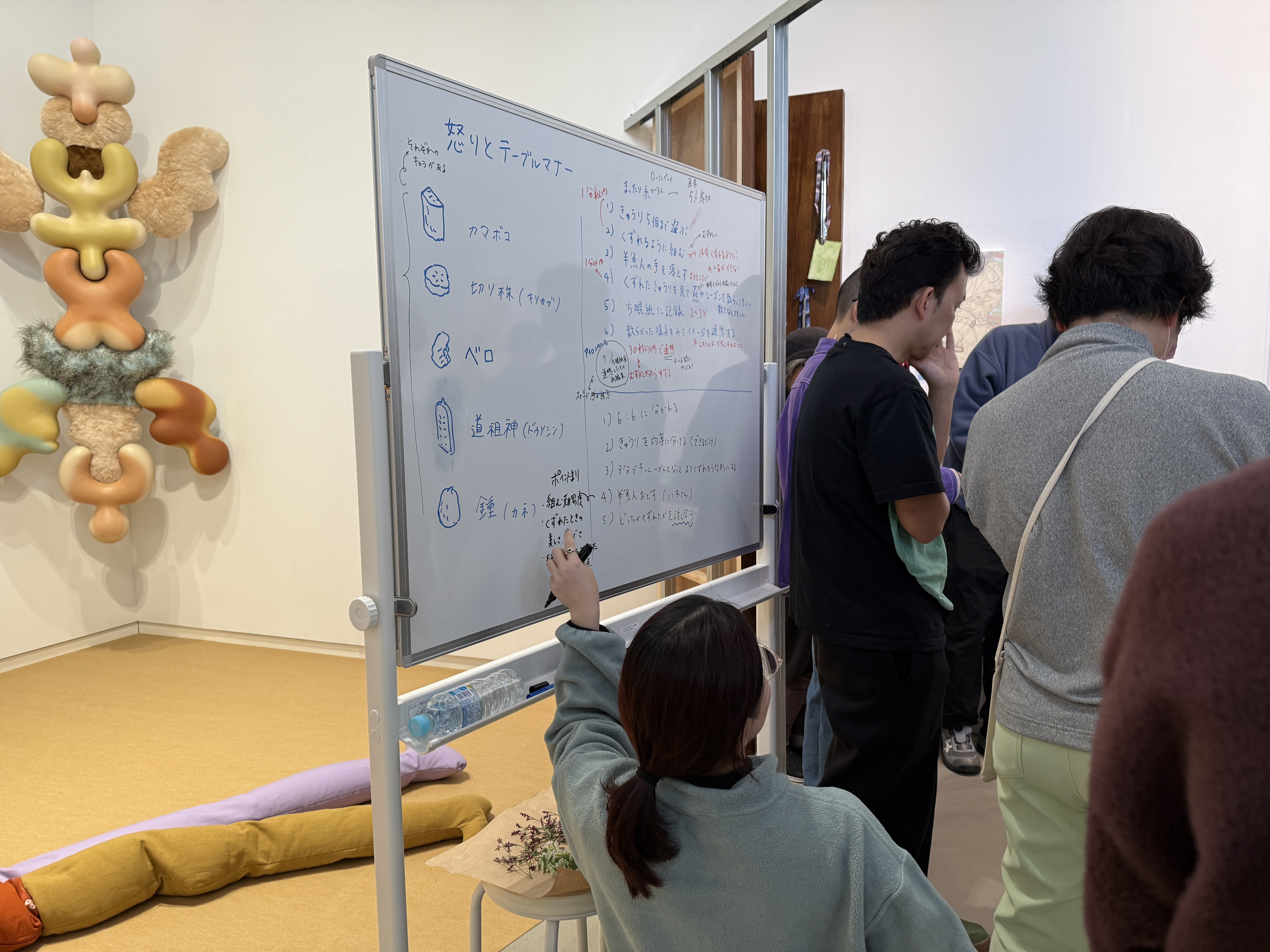 正に新感覚の、独特なプログラム。最初は戸惑い気味だった参加者も、いつの間にか夢中になり、もっとゲームを面白くしようと誰もが積極的に関わっていった様子が大変印象深い。答えを与えるのではなく、自由な発想の連鎖に委ねる様は正に八木さんの制作態度のようで、きっと参加者は八木さんが制作中に味わう面白さの一端を体感できたことだろう。(本展運営アシスタント:山下港)