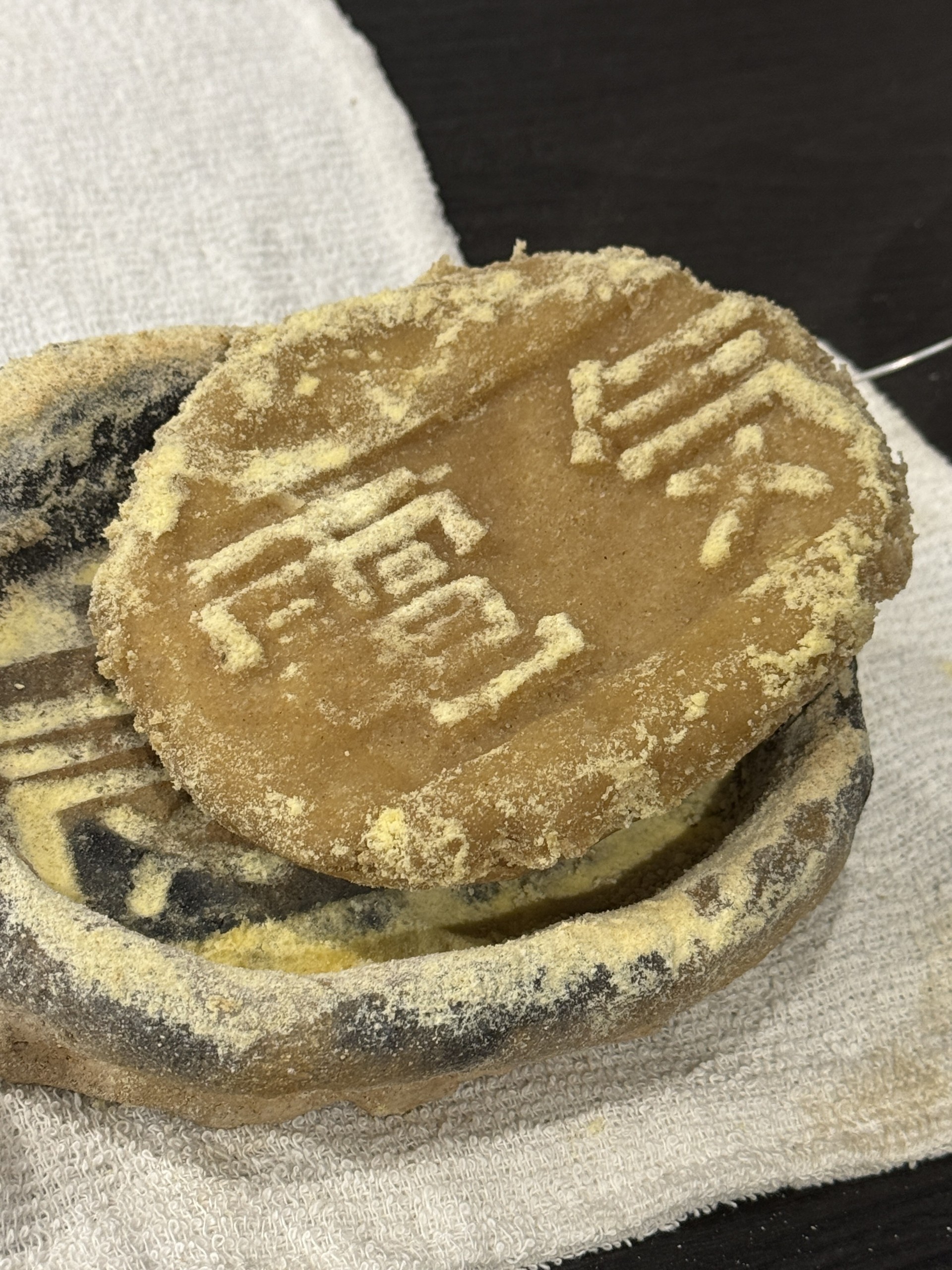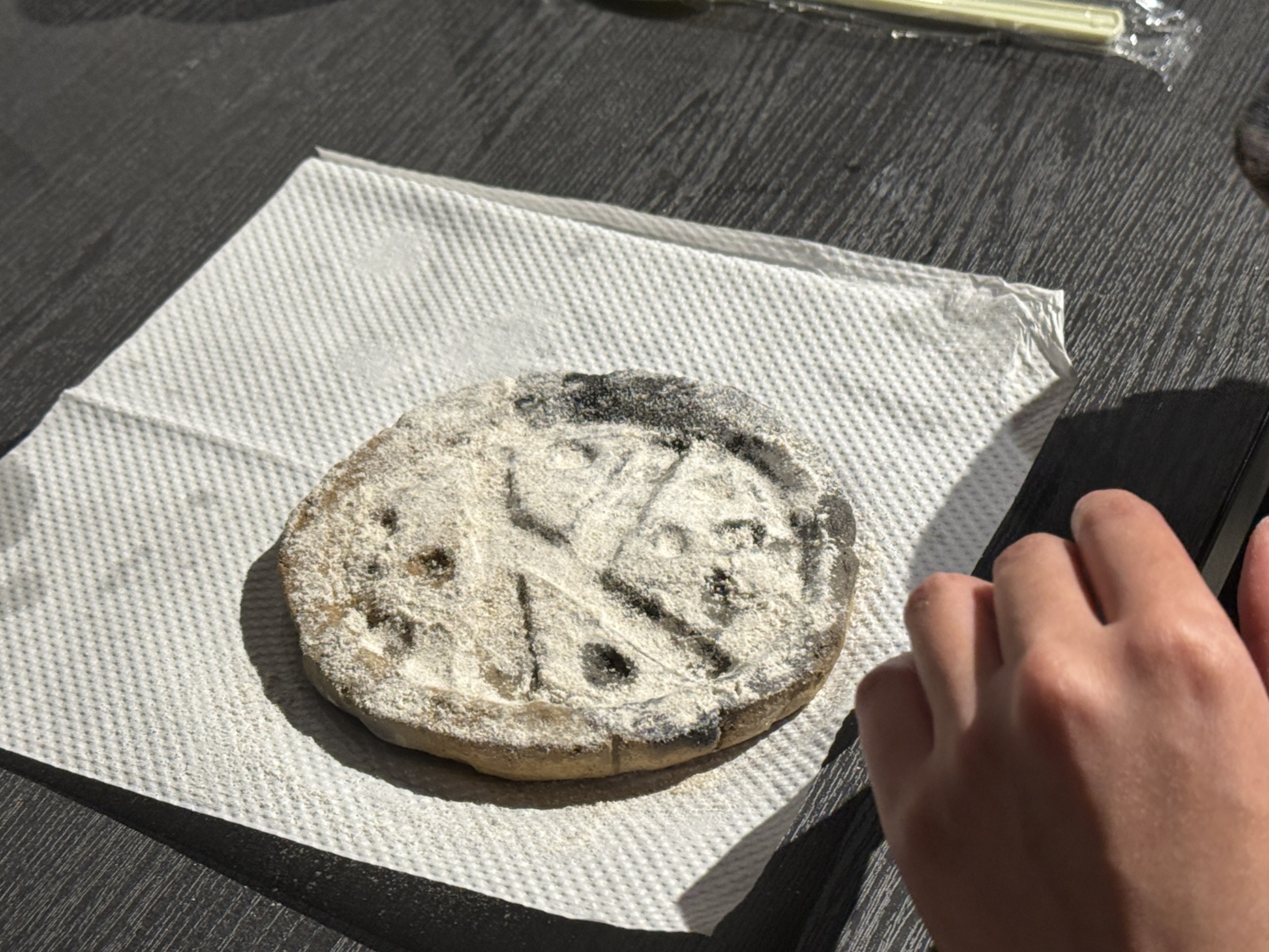 2日目、粘土の東京駅は素朴な焼き物になっていた。約3週間の間に坂本さんが焼き上げてくれていたのだ。各自、自分の焼き物を手にし、粘土の時とは変わった土の感触を確かめる。そしてその焼き物にオリーブ油を塗っていく。多過ぎるぐらいで良いと言う坂本さんの言葉通り、焼き物はいくらでもオリーブ油を吸収して、まるで生き物のようだ。十分オリーブ油を塗ったら、その上にライ麦粉を厚く振りかけて準備は完了。焼き物にパン生地を流し込み、オーブンで焼き始める。焼いている間、それぞれがどこで型を取ったのか、なぜそこを選んだのか、写真と共に話を共有していく。エピソードに個性がはっきりと表れる。そしてパンが焼き上がると、ヘラや竹串を使い、焼き物からパンを外していく…のだが、この時参加者は初めて、坂本さんが繰り返し難しいと言っていた意味を知る。パンがなかなか外れないのだ。焼き物の形、オリーブ油と粉の量など、色んな条件が上手くいかないと、パンは焼き物にくっついてしまう。でも、だからこそ、ようやく食べられたパンは格別だ。まるで人類が初めてパンを食べた瞬間のように喜ぶ参加者の姿が忘れられない。