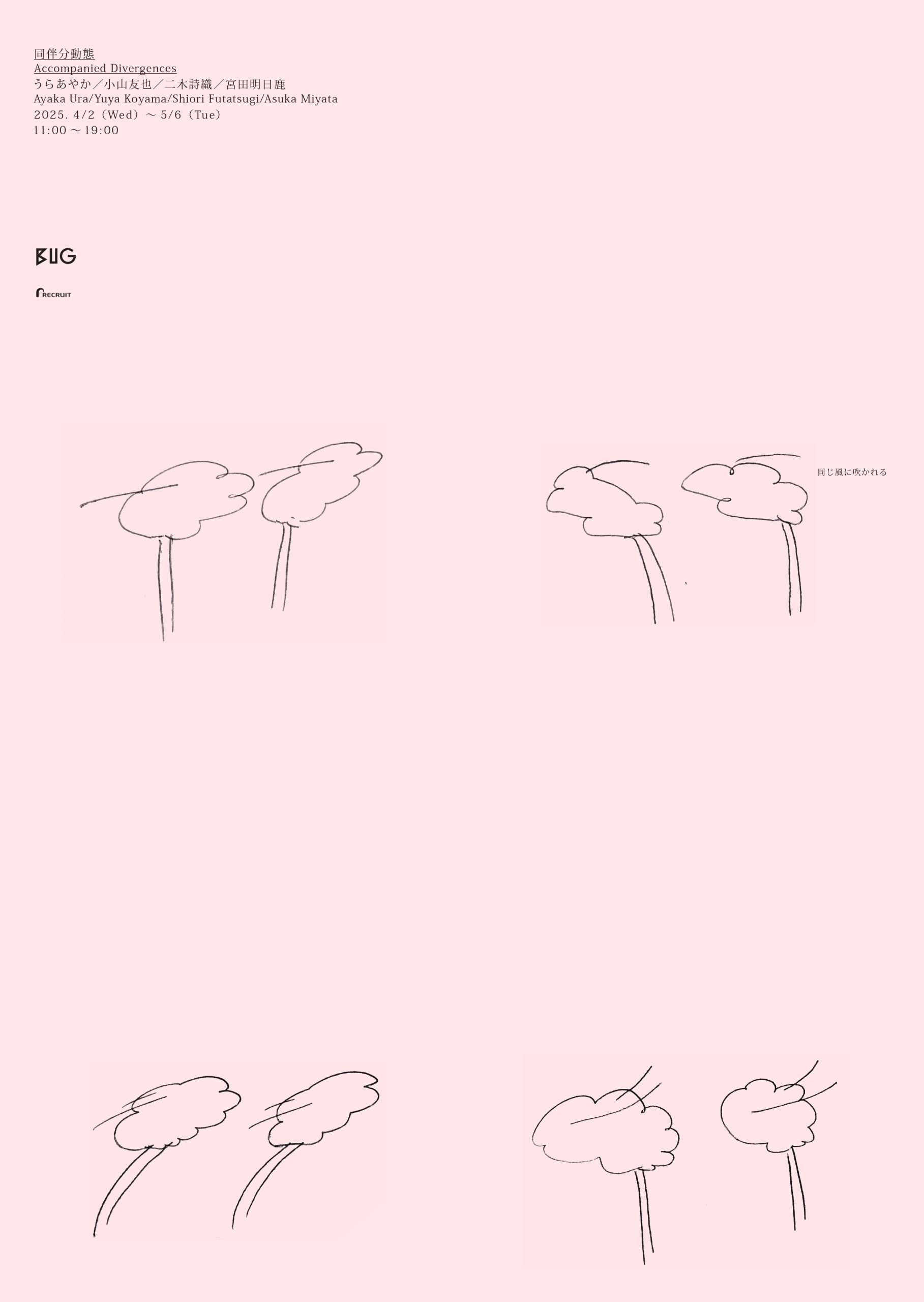 そのほか会場内には、出展アーティストとBUGスタッフの野瀬が書いた日記をまとめた冊子を配架します。この日記を書く取り組みは、うらからの呼びかけにより始まりました。2021年から自身のブログを公開しているうらにとって日記は、目の前で起こっていることを基にイメージを膨らませたり、過去を想起して自由に実験のできる公開スタジオとして機能してきました。今回、5名の日記には、作品制作のプロセスやモヤモヤとした悩み、ついつい考えてしまうことなどが綴られます。作品と日記が同じ空間に並置されることで、鑑賞する方々も発想の過程に同伴・分動し、作品の多層性を感じていただけることでしょう。