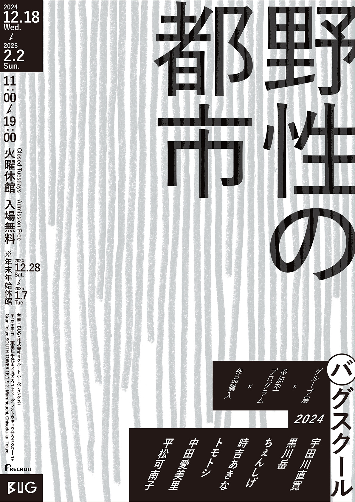 秩序や合理性ではなく、個の感覚と意見が行き交う学び場を強調するために、タイトルには「野性」という語をつけました。本プロジェクトでは本能やプリミティブな感覚、私的な視点を意味し、参加アーティストのユニークな野性から「都市」を捉えた作品を展示します。BUGの周辺環境に身体を介入させて都市との関わりを考えた作品や、東京駅周辺だけではなく都市風景の隅っこや見えない気配からイメージを膨らませた作品、都市に住む生物や往来する人々に焦点を当てた作品、さらに都市で生きるアーティスト自らの生活に向き合った作品など、7名の野性な感覚を味わえる新作群が展開予定です。
