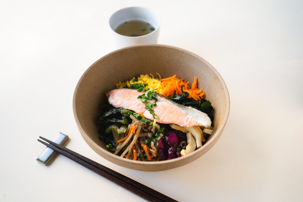 焼鮭定食を一つのお椀の中で表現するために、メニューは和風ビビンバにしました。