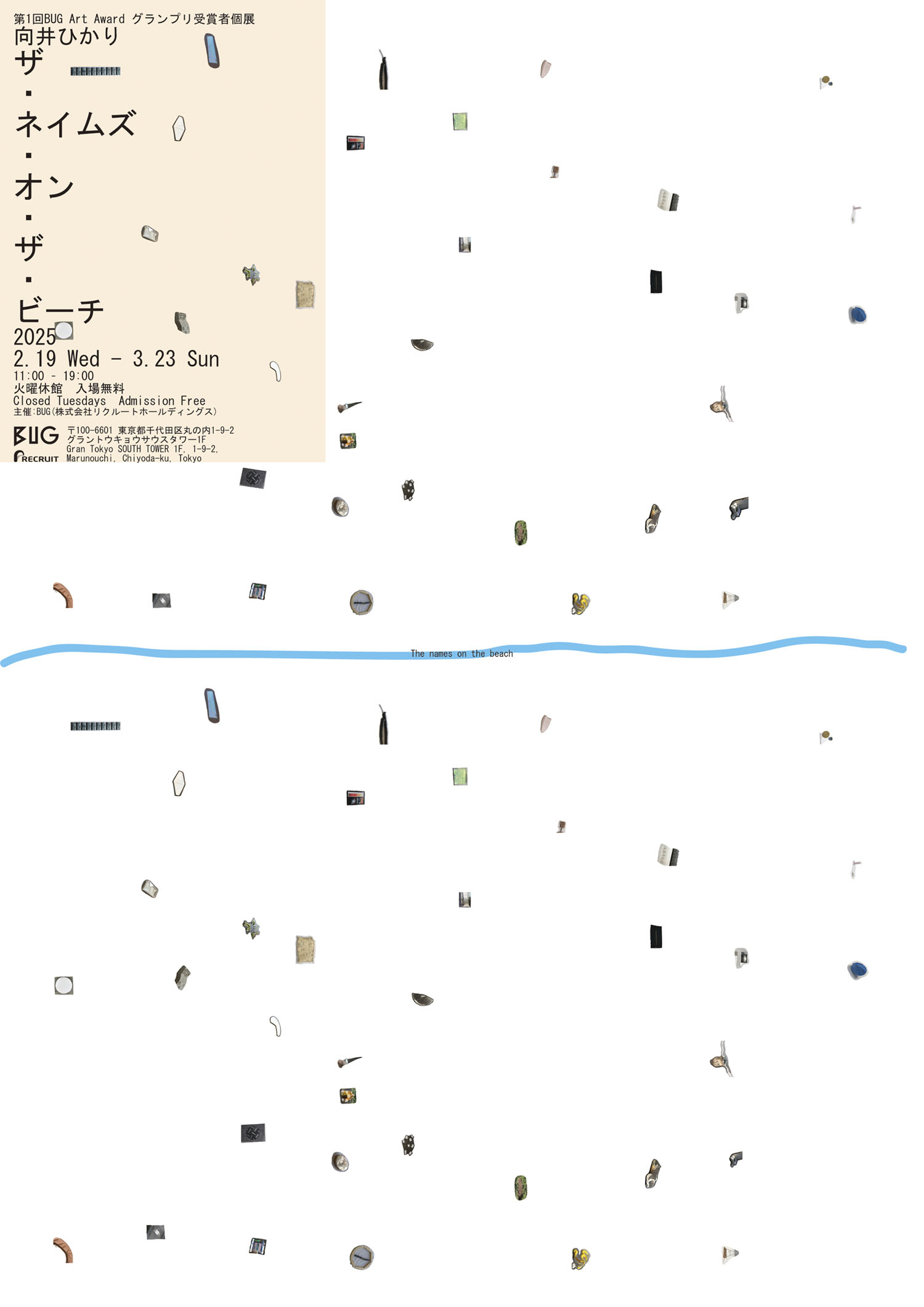2025年2月19日(水)より、第1回BUG Art Awardでグランプリを受賞した向井ひかりによる個展「ザ・ネイムズ・オン・ザ・ビーチ」を開催します。向井ひかりは、人の目線の高さほどある白い箱の側面や上部に、ストローや砂、鏡といった、誰もが日常的に目にしている素材を使った小さな立体作品や、ドローイング、映像を配置した「対岸は見えない」で、第1回BUG Art Award*にてグランプリを受賞しました。審査員からは独創的な着眼点とアイディア、そしてBUGの空間を意識した展示方法が評価されました。本展は、新しい表現への挑戦や、アーティストとしてのキャリアを支援することを目的としています。