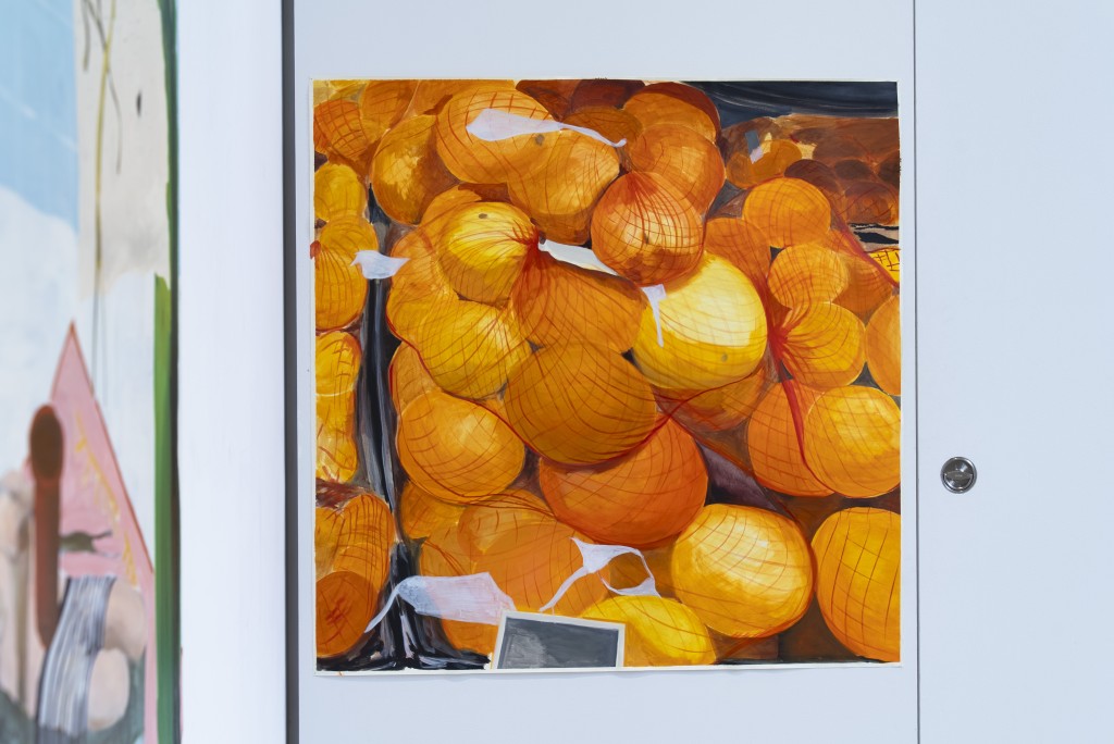 矢野は、街で見かけたフルーツ、切り開いたパンツ、職場から見える海など、日常の中で気になったものや出来事をモチーフに、アクリル絵具、クレヨン、オイルパステル、デジタルソフトなどさまざまな素材を用いて絵画を制作してきました。近年は、自身の身体や男性性といった個人的なテーマも取り入れながら、絵画と単語帳を組み合わせたインスタレーションを展開しています。