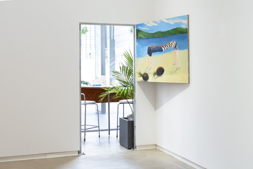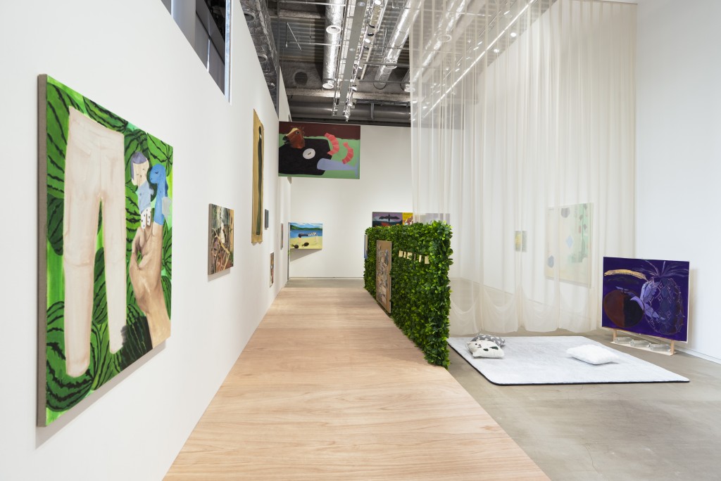 また今回は、普段は閉じられているBUGとカフェをつなぐ扉を開放し、空間に新たな動線を生み出します。さらに展示空間の外側であるカフェの壁にも作品を展示。会場には、向こう側がぼんやりと透けて見えるカーテンやスロープを設置することで空間がゆるやかに仕切られるなど、「内と外」の意識は作品に対する姿勢だけではなく、会場構成にも表れています。
